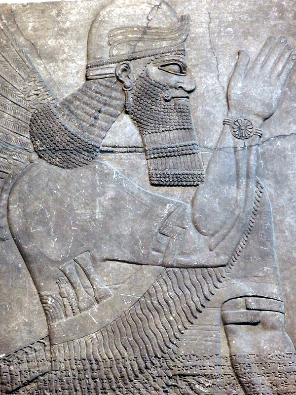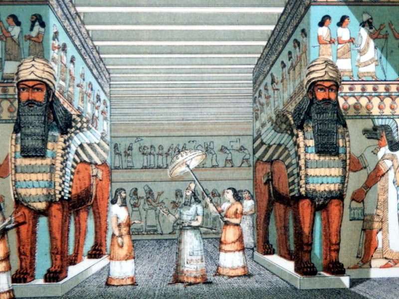 One complete corridor at Nineveh was lined with these reliefs in large scale, though only three survive, and a second set of smaller reliefs with three registers was situated in a private gate-chamber on an upper floor in the same palace.