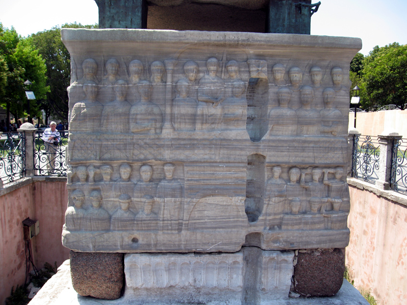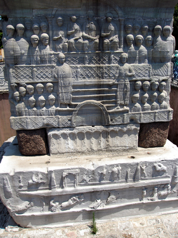 The reliefs on the plinth’s four faces are 6 metres high and show Theodosius I with statesmen and friends watching racing from the royal box, holding out a laurel crown to a champion, accepting gifts from foreign envoys and watching a dancing performance.