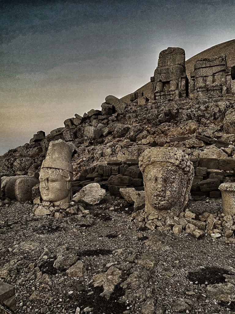 The sanctuary crowns a stone tumulus on the mountain’s peak and is flanked by terraces facing east and west. On these terraces stand colossal seated figures representing a syncretic assembly of deities and royal images—combinations of Persian, Anatolian and Greek iconography that reflect Commagene’s position between Iran and the Roman east. The statues originally included depictions of Zeus-Oromasdes, Apollo-Mithras-Helios, Heracles-Artagnes, the goddess Tyche and a monumental likeness of Antiochus himself, enthroned among the gods. Over centuries many statue heads fell from their bodies and now lie scattered at the feet of the seated figures, a haunting scene that amplifies the site’s power.